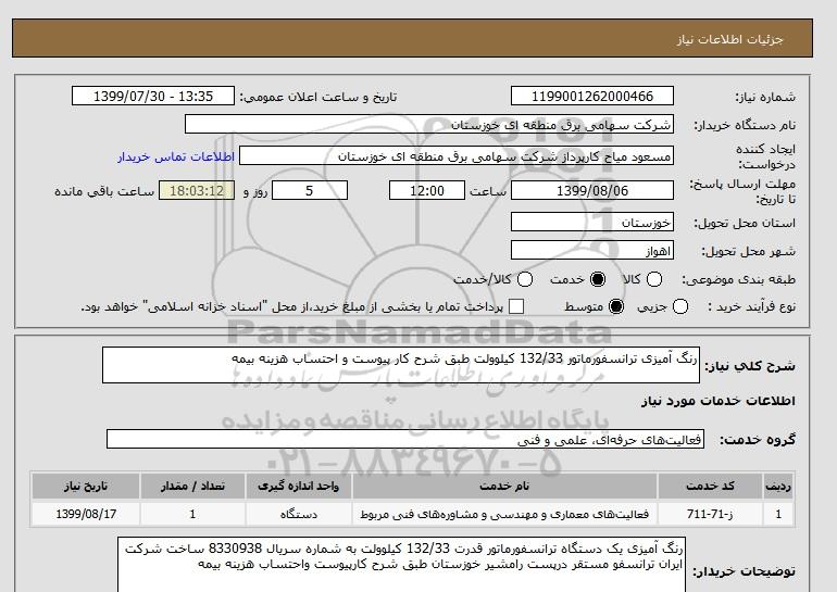 شرح کلی نیاز: رنگ آمیزی ترانسفورماتور 132/33 کیلوولت طبق شرح کار پیوست و احتساب هزینه بیمه