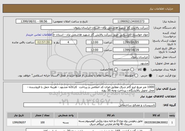 نام دستگاه خریدار:شرکت پالایش گاز شهید هاشمی نژاد - استان خراسان رضوی