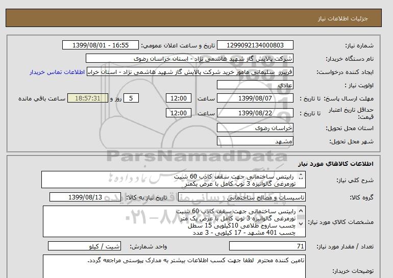 نام دستگاه خریدار:شرکت پالایش گاز شهید هاشمی نژاد - استان خراسان رضوی