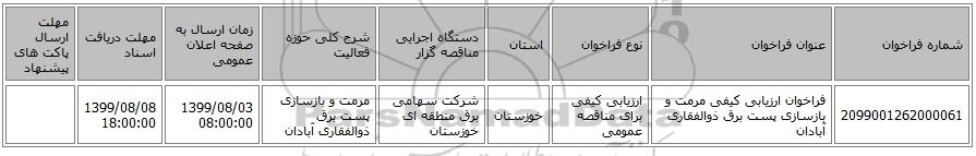 مناقصه، فراخوان ارزیابی کیفی مرمت و بازسازی پست برق ذوالفقاری آبادان, فراخوان ارزیابی کیفی مرمت و بازسازی پست برق ذوالفقاری آبادان