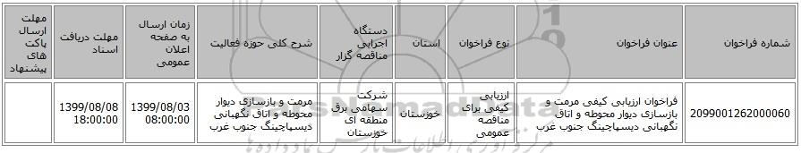 مناقصه، فراخوان ارزیابی کیفی مرمت و بازسازی دیوار محوطه و اتاق نگهبانی دیسپاچینگ جنوب غرب, فراخوان ارزیابی کیفی مرمت و بازسازی دیوار محوطه و اتاق نگهبانی دیسپاچینگ جنوب غرب