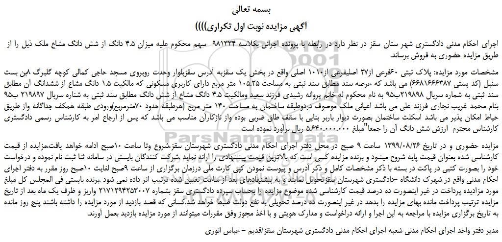 اجرای احکام مدنی دادگستری شهر ستان سقز در نظر دارد در رابطه با پرونده اجرائی بکلاسه 981334  سهم محکوم علیه میزان 4.5 دانگ از شش دانگ مشاع ملک ذیل را از طریق مزایده حضوری به فروش برساند.