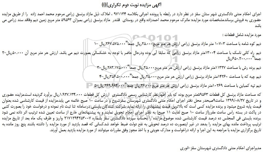 اجرای احکام مدنی دادگستری شهر ستان سقز در نظر دارد در رابطه با پرونده اجرائی بکلاسه 971134 ، املاک ذیل مازاد برنسق زراعی مرحوم محمد احمد زاده را از طریق مزایده حضوری به فروش برساند.مشخصات مورد مزایده: ماترک مرحوم محمد احمدزاده واقع در روستای قلندر مازاد برنسق زراعی بمیزان 59563 متر مربع زمین دیم وفاقد سند زراعی می باشد