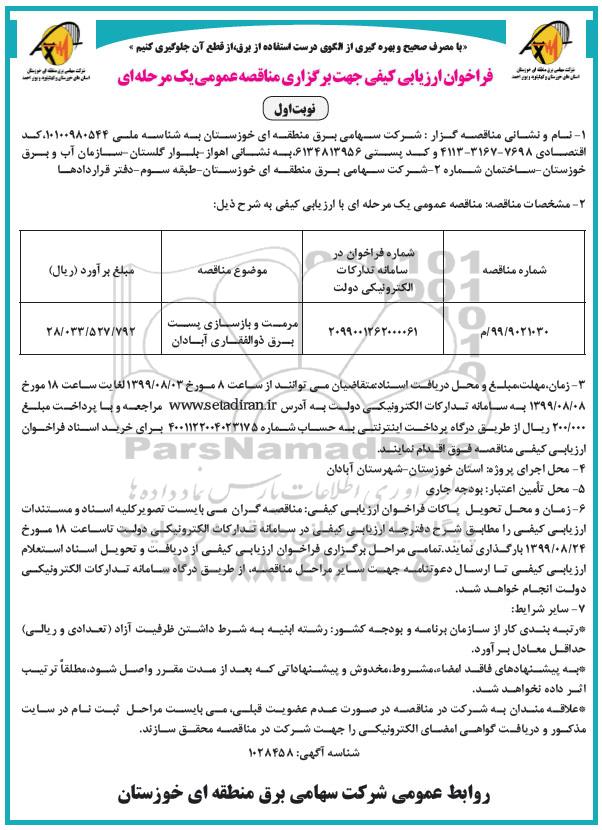 | 99/9021030/م | 2099001262000061 | مرمت و بازسازی پست برق ذوالفقاری آبادان | 28.033.527.792 |