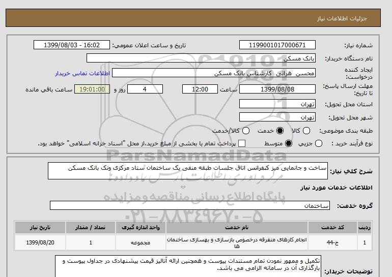 شرح کلی نیاز: ساخت و جانمایی میز کنفرانس اتاق جلسات طبقه منفی یک ساختمان ستاد مرکزی ونک بانک مسکن