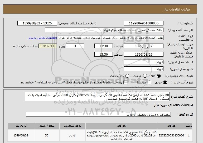 شرح کلی نیاز: 50 کارتن کاغذ 132 ستونی تک نسخه ایی 70 گرمی با ابعاد 28*38 و کارتن 2000 برگی با آرم آجری بانک مسکن - ارسال کالا به عهده فروشنده میباشد -