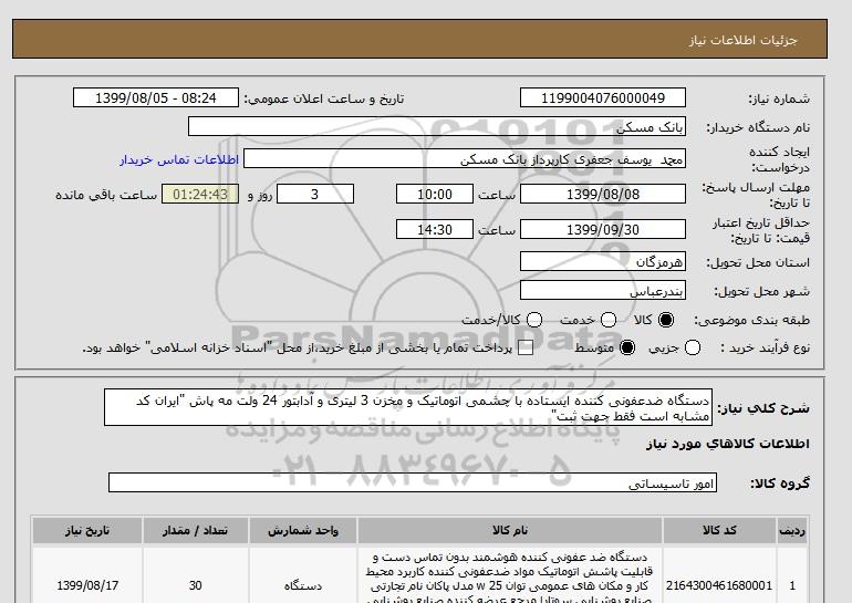 شرح کلی نیاز: دستگاه ضدعفونی کننده ایستاده با چشمی اتوماتیک و مخزن 3 لیتری و آدابتور 24 ولت مه پاش "ایران کد مشابه است فقط جهت ثبت"