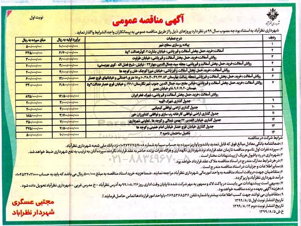 شهرداری نظرآباد به استناد بودجه مصوب سال 99 در نظر دارد پروژه های  ذیل را از طریق مناقصه عمومی به پیمانکاران واجدالشرایط واگذار نماید.