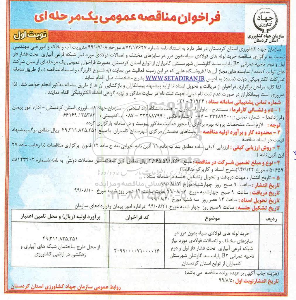 سازمان جهاد کشاورزی استان کردستان در نظر دارد مدیریت آب و خاک و امور فنی مهندسی نسبت به برگزاری مناقصه خرید لوله های فولادی سیاه بدون درز در سایزهای مختلف و اتصالات فولادی مورد نیاز شبکه فرعی آبیاری تحت فشار فاز اول ودوم ناحیه عمرانی B2 پایاب سد گاوشان شهرستان کامیاران از توابع استان کردستان بصورت فراخوان عمومی یک مرحله ای از میان شرکت های تولید کننده - نماینده مجاز ان - فروشگاه های که در این زمینه فعالیت می نمایند به شرک کار برگ و اسناد مناقصه از طریق سامانه تدارکات الکترونیکی دولت ستاد به آدرس ستاد ایران به شرح مشخصات ذیل