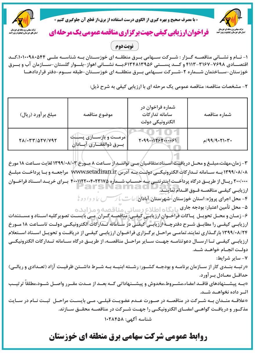 | 99/9021030/م | 2099001262000061 | مرمت و بازسازی پست برق ذوالفقاری آبادان | 28.033.527.792 |