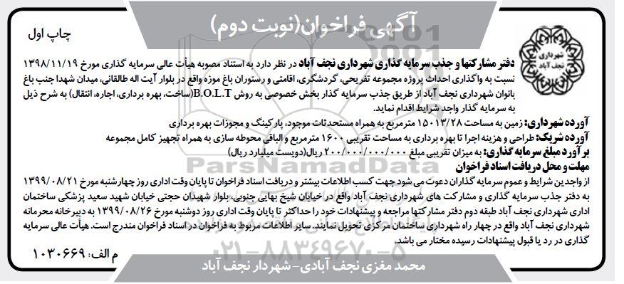دفتر مشارکتها و جذب سرمایه گذاری شهرداری نجف آباد در نظر دارد نسبت به واگذاری احداث پروژه مجموعه تفریحی ، گردشگری ، اقامتی و رستوران باغ موزه واقع در بلوار ایت اله طالقانی میدان شهدا جنب باغ بانوان شهرداری نجف آباد از طریق جذب سرمایه گذار بخش خصوصی به روش BOLT ساخت بهره برداری اجاره انتقال به شرح ذیل به سرمایه گذار واجد شرایط اقدام نماید