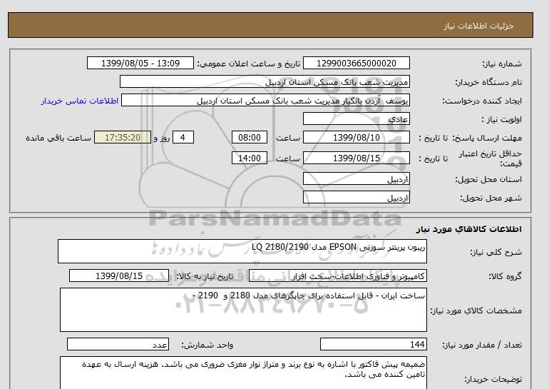 نام دستگاه خریدار:مدیریت شعب بانک مسکن استان اردبیل