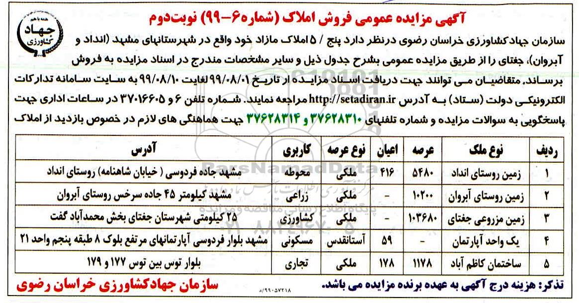 مزایده فروش 5 املاک مازاد نوبت دوم شماره 6-99