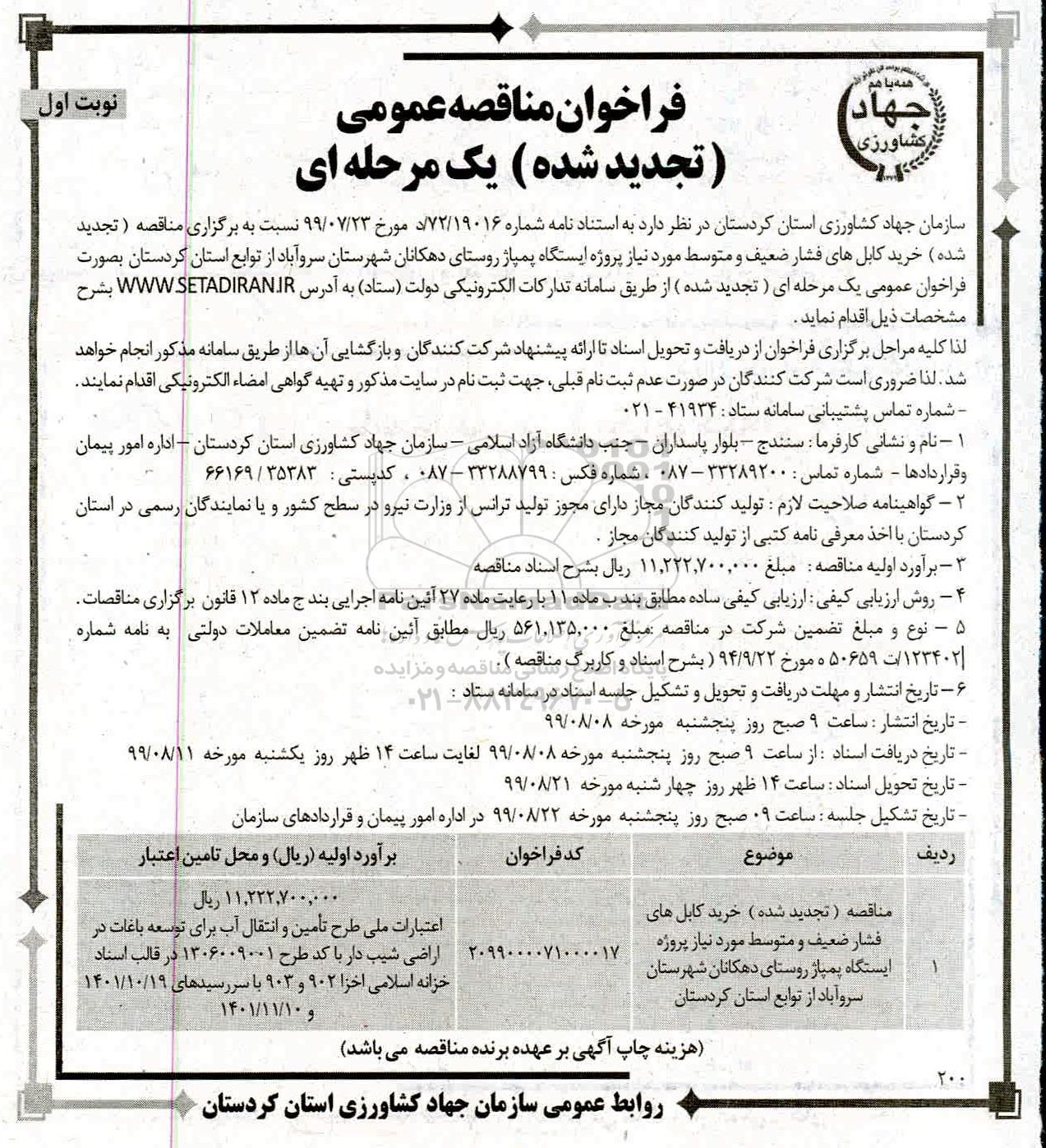 سازمان جهاد کشاورزی استان کردستان در نظر دارد نسبت به برگزاری مناقصه تجدید شده خرید کابل های فشار ضعیف و متوسط مورد نیاز پروژه ایستگاه پمپاژ روستای دهکانان شهرستان سروآباد از توابع کردستان صورت فراخوان عمومی یک مرحله ای از طریق سامانه تدارکات الکترونیکی دولت ستاد به آدرس ستاد ایران به شرح مشخصات ذیل