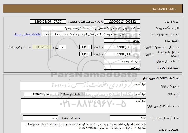 نام دستگاه خریدار:شرکت پالایش گاز شهید هاشمی نژاد - استان خراسان رضوی