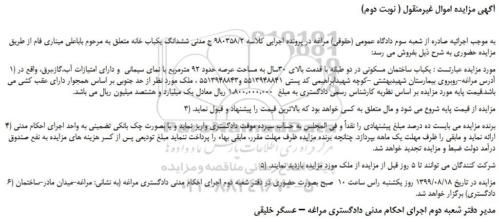 به موجب اجرائیه صادره از شعبه سوم دادگاه عمومی (حقوقی) مراغه در پرونده اجرایی کلاسه 980358/2 ج مدنی ششدانگ یکباب خانه متعلق به مرحوم باباعلی میناری فام از طریق مزایده حضوری به شرح ذیل بفروش می رسد: