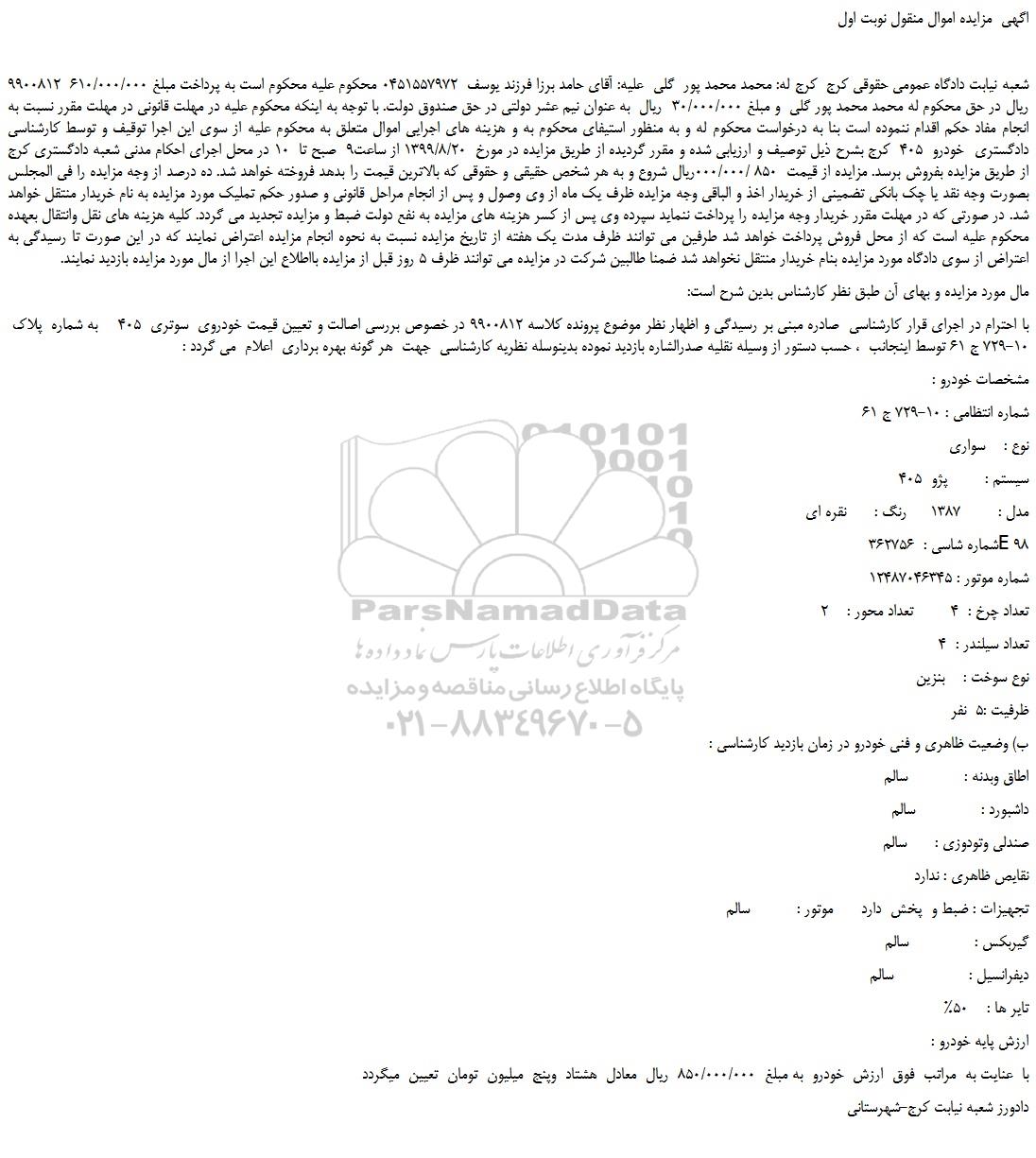 9900812 شعبه نیابت دادگاه عمومی حقوقی کرج کرج له: محمد محمد پور گلی علیه: آقای حامد برزا فرزند یوسف 0451557972 محکوم علیه محکوم است به پرداخت مبلغ 610/000/000 ریال در حق محکوم له محمد محمد پور گلی و مبلغ 30/000/000 ریال به عنوان نیم عشر دولتی در حق صندوق دولت. با توجه به اینکه محکوم علیه در مهلت قانونی در مهلت مقرر نسبت به انجام مفاد حکم اقدام ننموده است بنا به درخواست محکوم له و به منظور استیفای محکوم به و هزینه های اجرایی اموال متعلق به محکوم علیه از سوی این اجرا توقیف و توسط کارشناسی دادگستری خودرو 405 کرج بشرح ذیل توصیف و ارزیابی شده و مقرر گردیده از طریق مزایده در مورخ 1399/8/20 از ساعت9 صبح تا 10 در محل اجرای احکام مدنی شعبه دادگستری کرج از طریق مزایده بفروش برسد. مزایده از قیمت 850 /000/000ریال شروع و به هر شخص حقیقی و حقوقی که بالاترین قیمت را بدهد فروخته خواهد شد. ده درصد از وجه مزایده را فی المجلس بصورت وجه نقد یا چک بانکی تضمینی از خریدار اخذ و الباقی وجه مزایده ظرف یک ماه از وی وصول و پس از انجام مراحل قانونی و صدور حکم تملیک مورد مزایده به نام خریدار منتقل خواهد شد. در صورتی که در مهلت مقرر خریدار وجه مزایده را پرداخت ننماید سپرده وی پس از کسر هزینه های مزایده به نفع دولت ضبط و مزایده تجدید می گردد. کلیه هزینه های نقل وانتقال بعهده محکوم علیه است که از محل فروش پرداخت خواهد شد طرفین می توانند ظرف مدت یک هفته از تاریخ مزایده نسبت به نحوه انجام مزایده اعتراض نمایند که در این صورت تا رسیدگی به اعتراض از سوی دادگاه مورد مزایده بنام خریدار منتقل نخواهد شد ضمنا طالبین شرکت در مزایده می توانند ظرف 5 روز قبل از مزایده بااطلاع این اجرا از مال مورد مزایده بازدید نمایند.