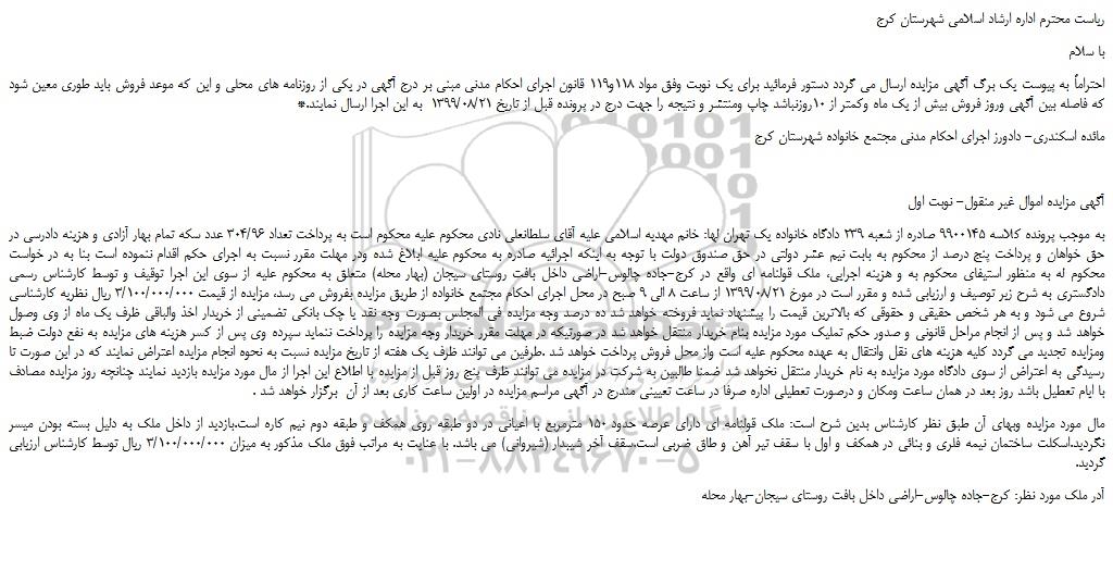 به موجب پرونده کلاسه 9900145 صادره از شعبه 239 دادگاه خانواده یک تهران لها: خانم مهدیه اسلامی علیه آقای سلطانعلی نادی محکوم علیه محکوم است به پرداخت تعداد 304/96 عدد سکه تمام بهار آزادی و هزینه دادرسی در حق خواهان و پرداخت پنج درصد از محکوم به بابت نیم عشر دولتی در حق صندوق دولت با توجه به اینکه اجرائیه صادره به محکوم علیه ابلاغ شده ودر مهلت مقرر نسبت به اجرای حکم اقدام ننموده است بنا به در خواست محکوم له به منظور استیفای محکوم به و هزینه اجرایی، ملک قولنامه ای واقع در کرج-جاده چالوس-اراضی داخل بافت روستای سیجان (بهار محله) متعلق به محکوم علیه از سوی این اجرا توقیف و توسط کارشناس رسمی دادگستری به شرح زیر توصیف و ارزیابی شده و مقرر است در مورخ 1399/08/21 از ساعت 8 الی 9 صبح در محل اجرای احکام مجتمع خانواده از طریق مزایده بفروش می رسد، مزایده از قیمت 3/100/000/000 ریال نظریه کارشناسی شروع می شود و به هر شخص حقیقی و حقوقی که بالاترین قیمت را پیشنهاد نماید فروخته خواهد شد ده درصد وجه مزایده فی المجلس بصورت وجه نقد یا چک بانکی تضمینی از خریدار اخذ والباقی ظرف یک ماه از وی وصول خواهد شد و پس از انجام مراحل قانونی و صدور حکم تملیک مورد مزایده بنام خریدار منتقل خواهد شد در صورتیکه در مهلت مقرر خریدار وجه مزایده را پرداخت ننماید سپرده وی پس از کسر هزینه های مزایده به نفع دولت ضبط ومزایده تجدید می گردد کلیه هزینه های نقل وانتقال به عهده محکوم علیه است واز محل فروش پرداخت خواهد شد .طرفین می توانند ظرف یک هفته از تاریخ مزایده نسبت به نحوه انجام مزایده اعتراض نمایند که در این صورت تا رسیدگی به اعتراض از سوی دادگاه مورد مزایده به نام خریدار منتقل نخواهد شد ضمنا طالبین به شرکت در مزایده می توانند ظرف پنج روز قبل از مزایده با اطلاع این اجرا از مال مورد مزایده بازدید نمایند چنانچه روز مزایده مصادف با ایام تعطیل باشد روز بعد در همان ساعت ومکان و درصورت تعطیلی اداره صرفا در ساعت تعیینی مندرج در آگهی مراسم مزایده در اولین ساعت کاری بعد از آن  برگزار خواهد شد .