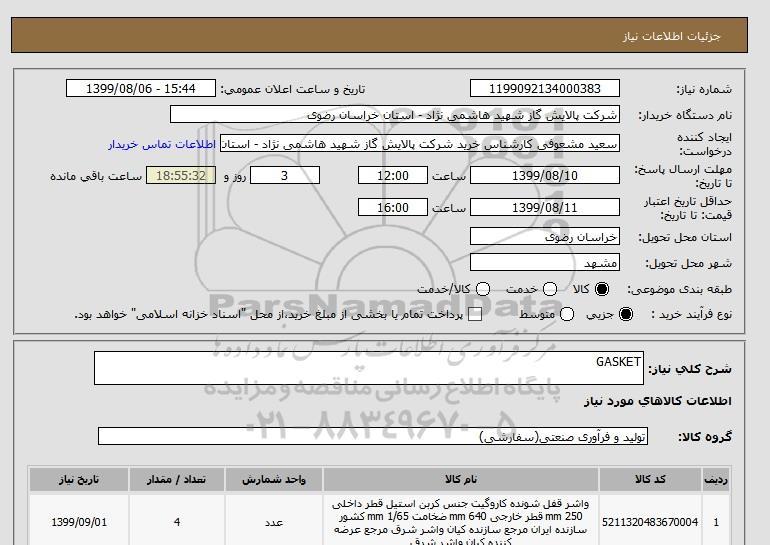 نام دستگاه خریدار:شرکت پالایش گاز شهید هاشمی نژاد - استان خراسان رضوی