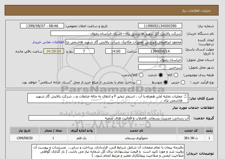شرح کلی نیاز: عملیات تخلیه لجن همراه با آب ، استخر تبخیر F و انتقال به چاله ضایعات و... شرکت پالایش گاز شهید هاشمی نژاد