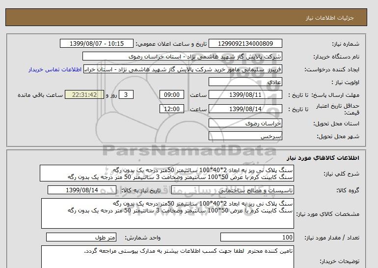 نام دستگاه خریدار:شرکت پالایش گاز شهید هاشمی نژاد - استان خراسان رضوی
