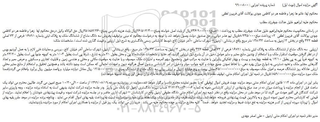 در راستای محکومیت محکوم علیه:ابراهیم خلیل عدالت جوفرزند مطلب به پرداخت : 1-مبلغ746/900/000ریال از بابت اصل خواسته ومبلغ26/513/400ریال بابت هزینه دادرسی ومبلغ35/857/360ریال حق الوکاله وکیل درحق محکوم لها  زهرا و فاطمه هر دو کاظمی جودی بوکالت آقای فریبرز لطفی  2- پرداخت مبلغ58/345/000ریال نیم عشر دولتی درحق صندوق دولت وصول خواهد شد. با توجه به درخواست محکوم له مبنی برتوقیف وفروش سه دانگ مشاع از ششدانگ ملک به پلاک ثبتی بشماره 16891 فرعی از 73 اصلی قطعه 423 واقع در بخش 3 اردبیل به مساحت 148/43 متر مربع واقع در بنشانی : اردبیل– شهرک ساحلی -آخر خیابان کاج ،توسط کارشناس رسمی دادگستری به شرح ذیل ارزیابی و قیمت گذاری شده است./. مشخصات ملک: