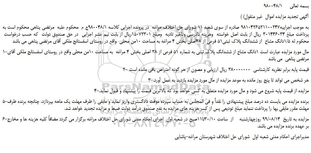 به موجب اجراییه9810426521100247 صادره از سوی شعبه 11 شورای حل اختلاف مراغه در پرونده اجرایی کلاسه 980048/1ج م محکوم علیه مرتضی پناهی محکوم است به پرداخت مبلغ 301446034 ریال از بابت اصل خواسته وهزینه دادرسی وتاخیر تادیه ومبلغ 15072301ریال از بابت نیم عشر اجرایی در حق صندوق دولت که حسب درخواست محکوم له 1/5دانگ مشاع از ششدانگ پلاک ثبتی51 فرعی از 38اصلی بخش 4 مراغه به مساحت 10من محلی واقع در روستای اسفستانج ملکی آقای مرتضی پناهی می باشد