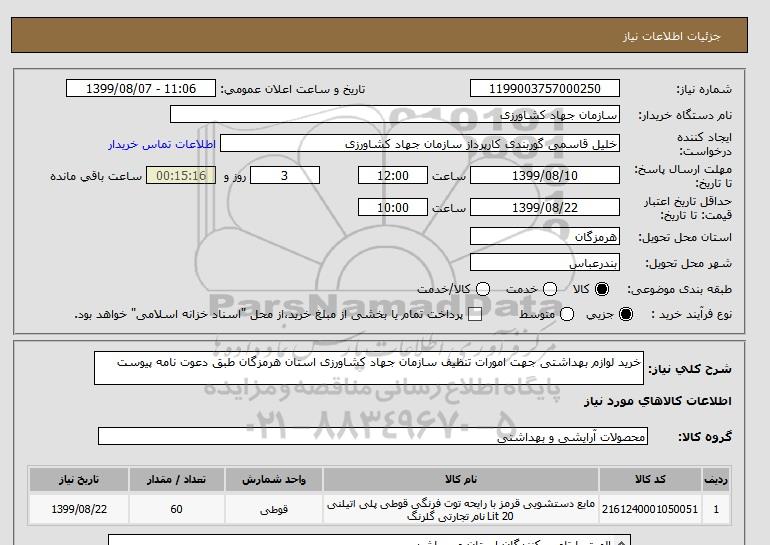 شرح کلی نیاز: خرید لوازم بهداشتی جهت امورات تنظیف سازمان جهاد کشاورزی استان هرمزگان طبق دعوت نامه پیوست