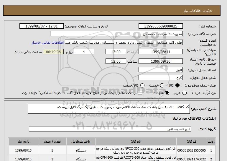 شرح کلی نیاز: کد کالاها مشابه می باشد . مشخصات اقلام مورد درخواست ، طبق یک برگ فایل پیوست.