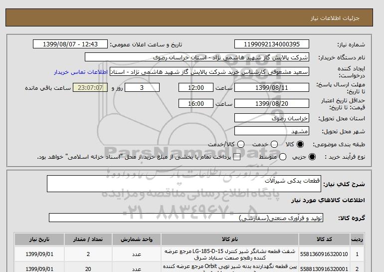 نام دستگاه خریدار:شرکت پالایش گاز شهید هاشمی نژاد - استان خراسان رضوی