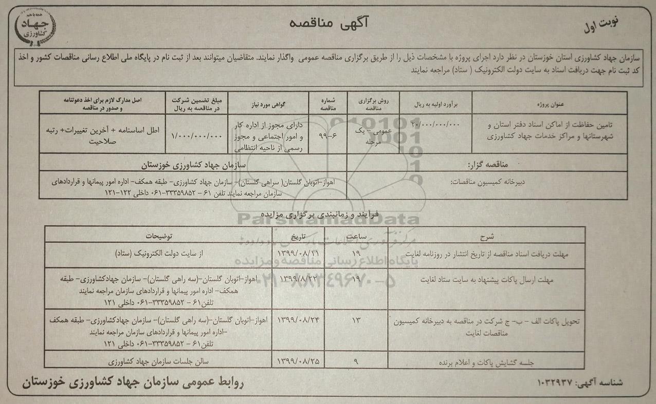 | تامین حفاظت از اماکن اسناد دفتر استان و شهرستانها و مراکز خدمات جهاد کشاورزی |