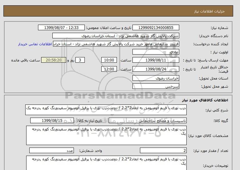 نام دستگاه خریدار:شرکت پالایش گاز شهید هاشمی نژاد - استان خراسان رضوی