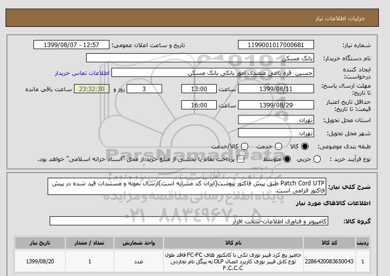 شرح کلی نیاز: Patch Cord UTP طبق پیش فاکتور پیوست(ایران کد مشابه است)ارسال نمونه و مستندات قید شده در پیش فاکتور الزامی است.