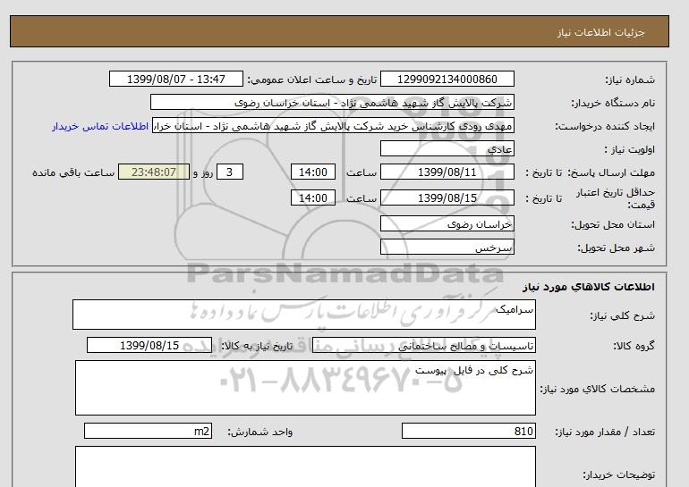 نام دستگاه خریدار:شرکت پالایش گاز شهید هاشمی نژاد - استان خراسان رضوی