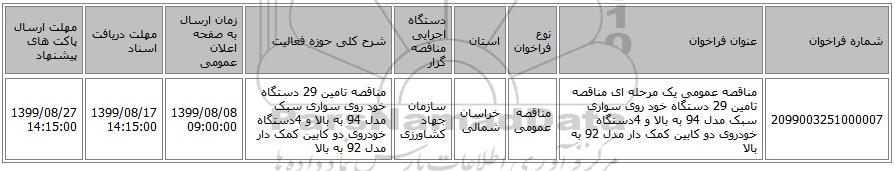 مناقصه، مناقصه عمومی یک مرحله ای مناقصه تامین 29 دستگاه خود روی سواری سبک مدل 94 به بالا و 4دستگاه خودروی دو کابین کمک دار مدل 92 به بالا , مناقصه عمومی یک مرحله ای مناقصه تامین 29 دستگاه خود روی سواری سبک مدل 94 به بالا و 4دستگاه خودروی دو کابین کمک دار مدل 92 به بالا
