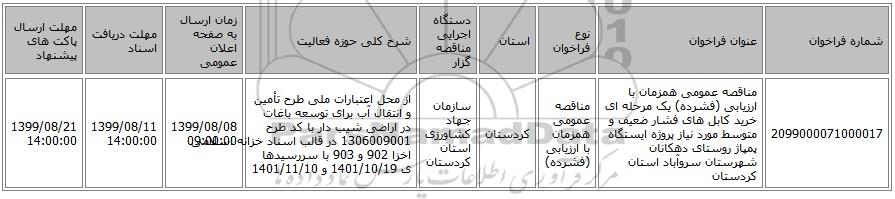 | 2099000071000017 | مناقصه عمومی همزمان با ارزیابی (فشرده) یک مرحله ای خرید کابل های فشار ضعیف و متوسط مورد نیاز پروژه ایستگاه پمپاژ روستای دهکانان شهرستان سروآباد استان کردستان | مناقصه عمومی همزمان با ارزیابی (فشرده) | کردستان | سازمان جهاد کشاورزی استان کردستان | از محل اعتبارات ملی طرح تأمین و انتقال آب برای توسعه باغات در اراضی شیب دار با کد طرح 1306009001 در قالب اسناد خزانه اسلامی اخزا 902 و 903 با سررسیدها ی 1401/10/19 و 1401/11/10 | 1399/08/08 09:00:00 | 1399/08/11 14:00:00 | 1399/08/21 14:00:00 |