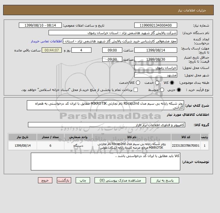 نام دستگاه خریدار:شرکت پالایش گاز شهید هاشمی نژاد - استان خراسان رضوی