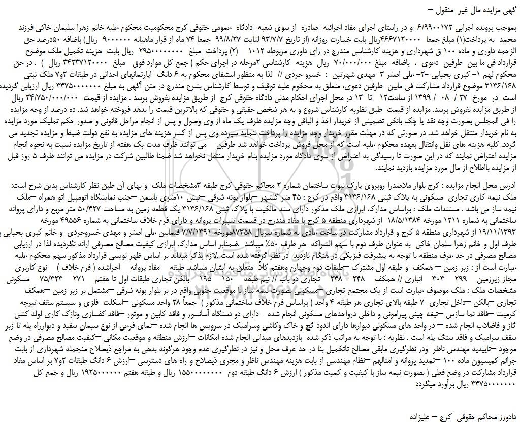 بموجب پرونده اجرایی 6/9900172 و در راستای اجرای مفاد اجرائیه صادره از سوی شعبه دادگاه عمومی حقوقی کرج محکومیت محکوم علیه خانم زهرا سلیمان خاکی فرزند محمد به پرداخت(1) مبلغ جمعا 4667120000ریال بابت خسارت روزانه (از تاریخ 93/7/7 لغایت 99/8/27 جمعا 74 ماه از قرار ماهیانه 9000000 ریال) باضافه 50درصد حق الزحمه داوری و ماده 100 ق شهرداری و هزینه کارشناسی مندرج در رای داوری مربوطه 1012 (2) پرداخت مبلغ 29500000000 ریال بابت هزینه تکمیل ملک موضوع قرارداد فی ما بین طرفین دعوی ، باضافه مبلغ 70/000/000 ریال هزینه کارشناسی 2مرحله در اجرای حکم ( جمع کل موارد فوق مبلغ 34237120000 ریال ) . در حق محکوم لهم 1- کبری یحیایی -2- علی اصغر 3 مهدی شهرتین : خسرو جردی // لذا به منظور استیفای محکوم به 6 دانگ آپارتمانهای احداثی در طبقات 2و7 ملک ثبتی 3136/168 موضوع قرارداد مشارکت فی مابین طرفین دعوی، متعلق به محکوم علیه توقیف و توسط کارشناس بشرح مندرج در متن آگهی به مبلغ 34750000000 ریال ارزیابی گردیده و مقرر است در مورخ 27 / 08 / 1399 از ساعت12 تا 13 در محل اجرای احکام مدنی دادگاه حقوقی کرج از طریق مزایده بفروش برسد . مزایده از قیمت 34/750/000/000 ریال از طریق مزایده بفروش برسد. مزایده از قیمت طبق نظریه کارشناس شروع و به هر شخص حقیقی و حقوقی که بالاترین قیمت را بدهد فروخته خواهد شد. ده درصد از وجه مزایده را فی المجلس بصورت وجه نقد یا چک بانکی تضمینی از خریدار اخذ و الباقی وجه مزایده ظرف یک ماه از وی وصول و پس از انجام مراحل قانونی و صدور حکم تملیک مورد مزایده به نام خریدار منتقل خواهد شد. در صورتی که در مهلت مقرر خریدار وجه مزایده را پرداخت ننماید سپرده وی پس از کسر هزینه های مزایده به نفع دولت ضبط و مزایده تجدید می گردد. کلیه هزینه های نقل وانتقال بعهده محکوم علیه است که از محل فروش پرداخت خواهد شد طرفین می توانند ظرف مدت یک هفته از تاریخ مزایده نسبت به نحوه انجام مزایده اعتراض نمایند که در این صورت تا رسیدگی به اعتراض از سوی دادگاه مورد مزایده بنام خریدار منتقل نخواهد شد ضمنا طالبین شرکت در مزایده می توانند ظرف 5 روز قبل از مزایده بااطلاع از مال مورد مزایده بازدید نمایند.