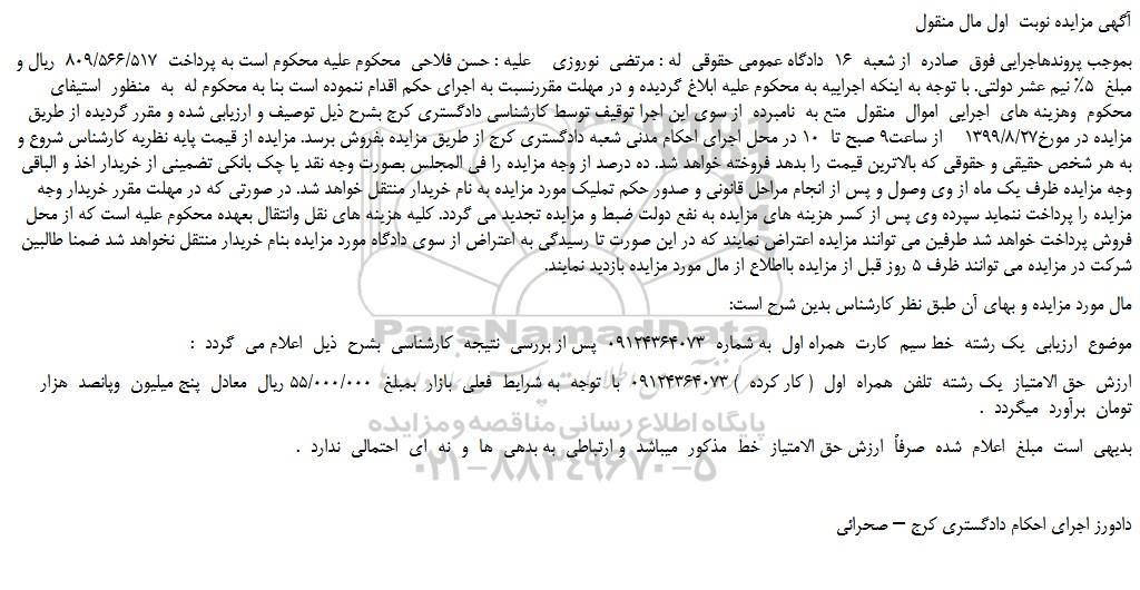 بموجب پروندهاجرایی فوق صادره از شعبه 16 دادگاه عمومی حقوقی له : مرتضی نوروزی علیه : حسن فلاحی محکوم علیه محکوم است به پرداخت 809/566/517 ریال و مبلغ 5% نیم عشر دولتی. با توجه به اینکه اجراییه به محکوم علیه ابلاغ گردیده و در مهلت مقررنسبت به اجرای حکم اقدام ننموده است بنا به محکوم له به منظور استیفای محکوم وهزینه های اجرایی اموال منقول متع به نامبرده از سوی این اجرا توقیف توسط کارشناسی دادگستری کرج بشرح ذیل توصیف و ارزیابی شده و مقرر گردیده از طریق مزایده در مورخ1399/8/27 از ساعت9 صبح تا 10 در محل اجرای احکام مدنی شعبه دادگستری کرج از طریق مزایده بفروش برسد. مزایده از قیمت پایه نظریه کارشناس شروع و به هر شخص حقیقی و حقوقی که بالاترین قیمت را بدهد فروخته خواهد شد. ده درصد از وجه مزایده را فی المجلس بصورت وجه نقد یا چک بانکی تضمینی از خریدار اخذ و الباقی وجه مزایده ظرف یک ماه از وی وصول و پس از انجام مراحل قانونی و صدور حکم تملیک مورد مزایده به نام خریدار منتقل خواهد شد. در صورتی که در مهلت مقرر خریدار وجه مزایده را پرداخت ننماید سپرده وی پس از کسر هزینه های مزایده به نفع دولت ضبط و مزایده تجدید می گردد. کلیه هزینه های نقل وانتقال بعهده محکوم علیه است که از محل فروش پرداخت خواهد شد طرفین می توانند مزایده اعتراض نمایند که در این صورت تا رسیدگی به اعتراض از سوی دادگاه مورد مزایده بنام خریدار منتقل نخواهد شد ضمنا طالبین شرکت در مزایده می توانند ظرف 5 روز قبل از مزایده بااطلاع از مال مورد مزایده بازدید نمایند.