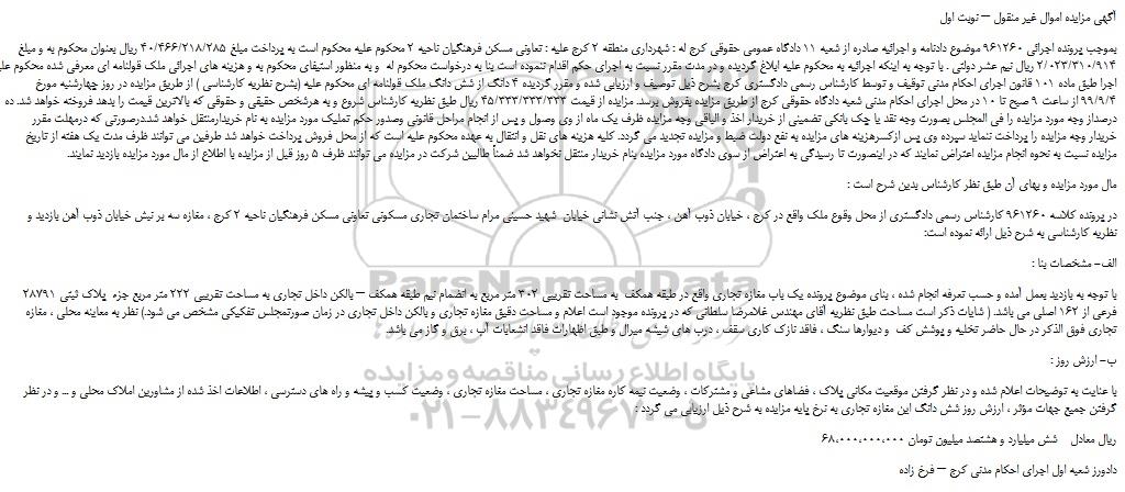 بموجب پرونده اجرائی 961260 موضوع دادنامه و اجرائیه صادره از شعبه 11 دادگاه عمومی حقوقی کرج له : شهرداری منطقه 2 کرج علیه : تعاونی مسکن فرهنگیان ناحیه 2 محکوم علیه محکوم است به پرداخت مبلغ 40/466/218/285 ریال بعنوان محکوم به و مبلغ 2/023/310/914 ریال نیم عشر دولتی . با توجه به اینکه اجرائیه به محکوم علیه ابلاغ گردیده و در مدت مقرر نسبت به اجرای حکم اقدام ننموده است بنا به درخواست محکوم له و به منظور استیفای محکوم به و هزینه های اجرائی ملک قولنامه ای معرفی شده محکوم علیه از سوی این اجرا طبق ماده 101 قانون اجرای احکام مدنی توقیف و توسط کارشناس رسمی دادگستری کرج بشرح ذیل توصیف و ارزیابی شده و مقرر گردیده 4 دانگ از شش دانگ ملک قولنامه ای محکوم علیه (بشرح نظریه کارشناسی ) از طریق مزایده در روز چهارشنبه مورخ 99/9/4 از ساعت 9 صبح تا 10 در محل اجرای احکام مدنی شعبه دادگاه حقوقی کرج از طریق مزایده بفروش برسد. مزایده از قیمت 45/333/333/333 ریال طبق نظریه کارشناس شروع و به هرشخص حقیقی و حقوقی که بالاترین قیمت را بدهد فروخته خواهد شد. ده درصداز وجه مورد مزایده را فی المجلس بصورت وجه نقد یا چک بانکی تضمینی از خریدار اخذ و الباقی وجه مزایده ظرف یک ماه از وی وصول و پس از انجام مراحل قانونی وصدور حکم تملیک مورد مزایده به نام خریدارمنتقل خواهد شد.درصورتی که درمهلت مقرر خریدار وجه مزایده را پرداخت ننماید سپرده وی پس ازکسرهزینه های مزایده به نفع دولت ضبط و مزایده تجدید می گردد. کلیه هزینه های نقل و انتقال به عهده محکوم علیه است که از محل فروش پرداخت خواهد شد طرفین می توانند ظرف مدت یک هفته از تاریخ مزایده نسبت به نحوه انجام مزایده اعتراض نمایند که در اینصورت تا رسیدگی به اعتراض از سوی دادگاه مورد مزایده بنام خریدار منتقل نخواهد شد ضمناً طالبین شرکت در مزایده می توانند ظرف 5 روز قبل از مزایده با اطلاع از مال مورد مزایده بازدید نمایند.