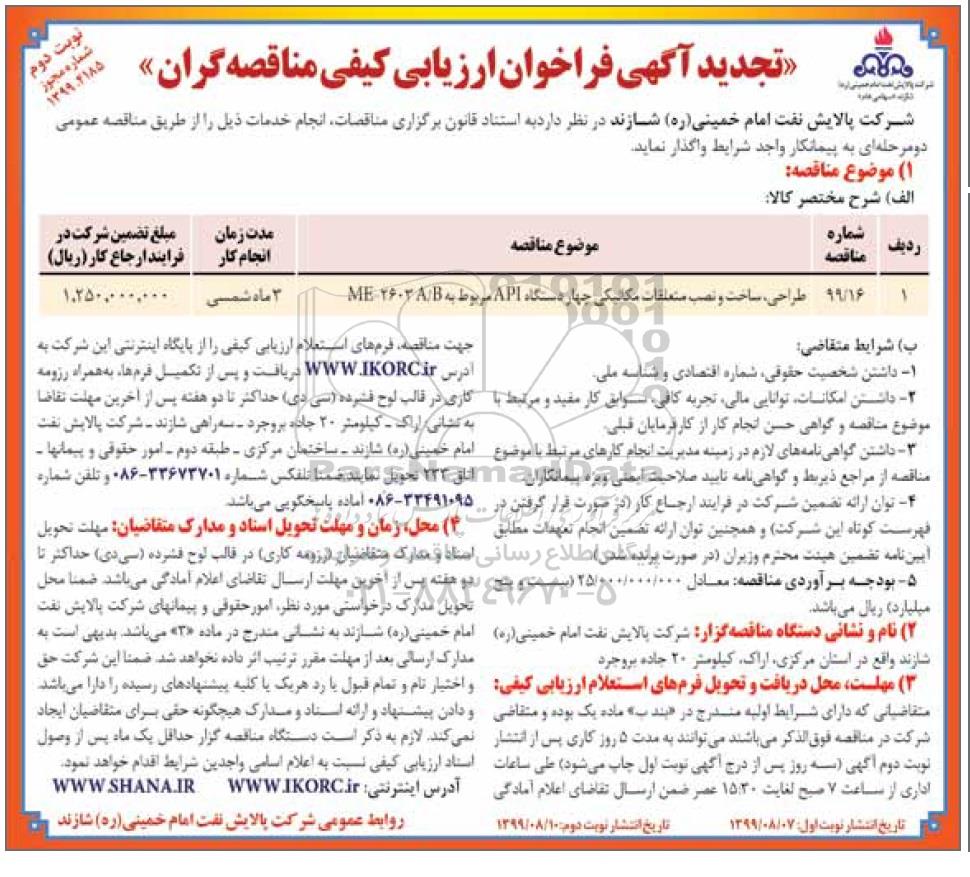 | 99/16 | طراحی، ساخت و نصب متعلقات مکانیکی چهار دستگاه API مربوط به ME-2603 A/B |