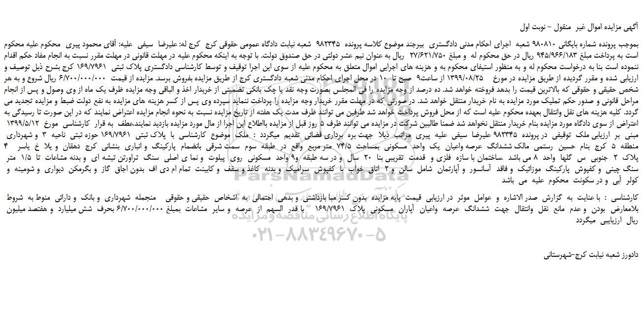 بموجب پرونده شماره بایگانی 980810 شعبه اجرای احکام مدنی دادگستری بیرجند موضوع کلاسه پرونده 982345 شعبه نیابت دادگاه عمومی حقوقی کرج کرج له: علیرضا سیفی علیه: آقای محمود پیری محکوم علیه محکوم است به پرداخت مبلغ 945/966/183 ریال در حق محکوم له و مبلغ 27/621/750 ریال به عنوان نیم عشر دولتی در حق صندوق دولت. با توجه به اینکه محکوم علیه در مهلت قانونی در مهلت مقرر نسبت به انجام مفاد حکم اقدام ننموده است بنا به درخواست محکوم له و به منظور استیفای محکوم به و هزینه های اجرایی اموال متعلق به محکوم علیه از سوی این اجرا توقیف و توسط کارشناسی دادگستری پلاک ثبتی 169/7961 کرج بشرح ذیل توصیف و ارزیابی شده و مقرر گردیده از طریق مزایده در مورخ 1399/08/25 از ساعت9 صبح تا 10 در محل اجرای احکام مدنی شعبه دادگستری کرج از طریق مزایده بفروش برسد. مزایده از قیمت 6/700/000/000 ریال شروع و به هر شخص حقیقی و حقوقی که بالاترین قیمت را بدهد فروخته خواهد شد. ده درصد از وجه مزایده را فی المجلس بصورت وجه نقد یا چک بانکی تضمینی از خریدار اخذ و الباقی وجه مزایده ظرف یک ماه از وی وصول و پس از انجام مراحل قانونی و صدور حکم تملیک مورد مزایده به نام خریدار منتقل خواهد شد. در صورتی که در مهلت مقرر خریدار وجه مزایده را پرداخت ننماید سپرده وی پس از کسر هزینه های مزایده به نفع دولت ضبط و مزایده تجدید می گردد. کلیه هزینه های نقل وانتقال بعهده محکوم علیه است که از محل فروش پرداخت خواهد شد طرفین می توانند ظرف مدت یک هفته از تاریخ مزایده نسبت به نحوه انجام مزایده اعتراض نمایند که در این صورت تا رسیدگی به اعتراض از سوی دادگاه مورد مزایده بنام خریدار منتقل نخواهد شد ضمنا طالبین شرکت در مزایده می توانند ظرف 5 روز قبل از مزایده بااطلاع این اجرا از مال مورد مزایده بازدید نمایند.عطف به قرار کارشناسی مورخ 1399/5/12 مبنی بر ارزیابی ملک توقیفی در پرونده 982345 علیرضا سیفی علیه پیری مراتب ذیلا جهت بره برداری قضائی تقدیم میگردد : ملک موضوع کارشناسی با پلاک ثبتی 169/7961 حوزه ثبتی ناحیه 3 و شهرداری منطقه 5 کرج بنام حسین رستمی مالک ششدانگ عرصه واعیان یک واحد مسکونی بمساحت 74/5 متر مربع واقع در طبقه سوم سمت شرقی بانضمام پارکینگ و انباری بنشانی کرج دهقان و یلا خ یاسر 4 پلاک 2 جنوبی س گلها واحد 8 می باشد .ساختمان با سازه فلزی و قدمت تقریبی بنا 20 سال و در سه طبقه و9 واحد مسکونی روی پیلوت و نما ی اصلی سنگ تراورتن تیشه ای و بدنه مشاعات تا 1/5 متر سنگ چینی و کفپوش پارکینگ موزائیک و فاقد آسانسور و آپارتمان شامل سالن و 2 اتاق خواب با کفپوش سرامیک و بدنه کاغذ و سقف و کابینت تمام ام دی اف بدون اجاق گاز و بگرمکن دیواری و شومینه و کولر آبی و در سکونت محکوم علیه می باشد