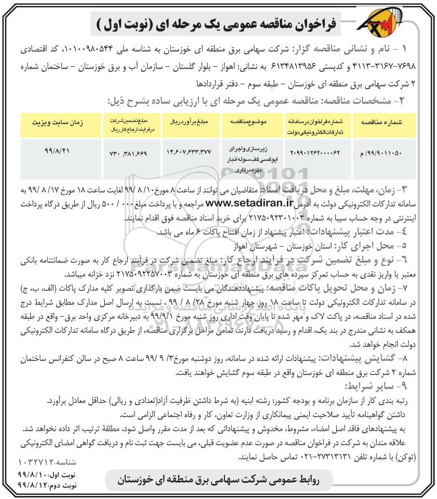8- گشایش پیشنهادات: پیشنهادات ارائه شده در سامانه روز دوشنبه مورخ 99.09.3 ساعت 8 صبح در سالن کنفرانس ساختمان شماره 2 شرکت برق منطقه ای خوزستان واقع در طبقه سوم گشایش خواهند یافت.