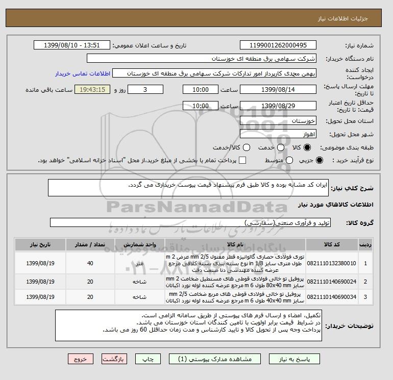 استعلام ایران کد مشابه بوده و کالا طبق فرم پیشنهاد قیمت پیوست خریداری می گردد., استعلام ایران کد مشابه بوده و کالا طبق فرم پیشنهاد قیمت پیوست خریداری می گردد.