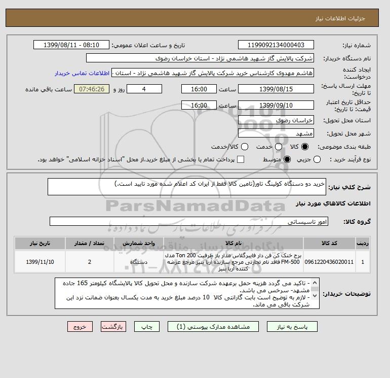 استعلام خرید دو دستگاه کولینگ تاور(تامین کالا فقط از ایران کد اعلام شده مورد تایید است.), استعلام خرید دو دستگاه کولینگ تاور(تامین کالا فقط از ایران کد اعلام شده مورد تایید است.)