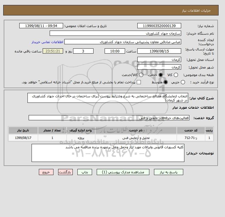 شرح کلی نیاز: انتخاب ازمایشگاه مصالح ساختمانی به شرح وشرایط پیوست (برای ساختمان در حال احداث جهاد کشاورزی در شهر کرمان)