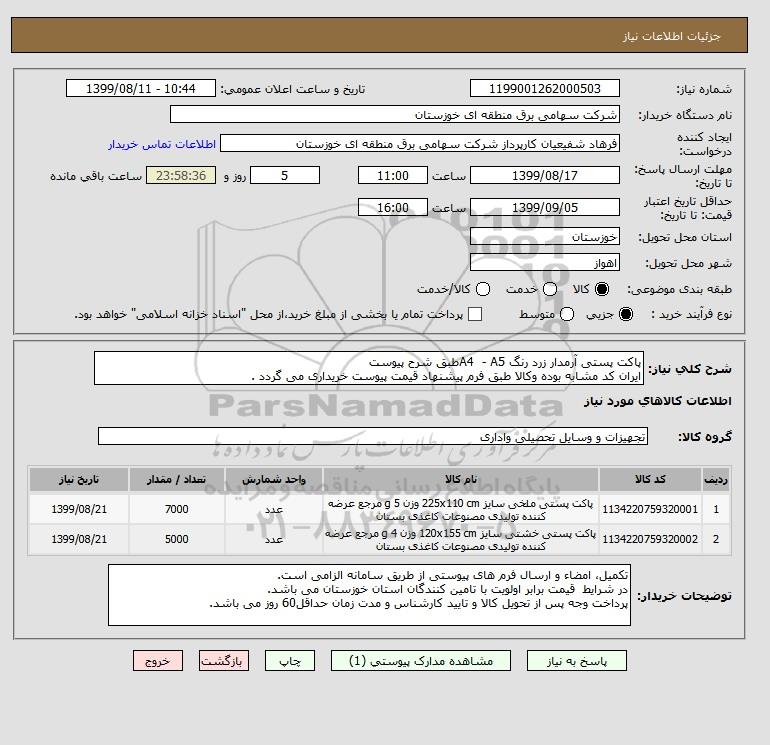 شرح کلی نیاز: پاکت پستی آرمدار زرد رنگ A4 - A5طبق شرح پیوست ایران کد مشابه بوده وکالا طبق فرم پیشنهاد قیمت پیوست خریداری می گردد .