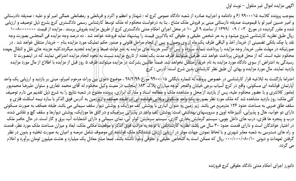 بموجب پرونده کلاسه ۹۹۰۰۰۱5 /6 و دادنامه و اجراییه صادره از شعبه دادگاه عمومی کرج له : شهناز و اعظم و اکرم و قربانعلی و رمضانعلی همگی امیر لو و علیه : صدیقه دادرستانی و امیر حسین امیر لو با قیمومیت صدیقه دارستانی مبنی بر فروش ملک مشاع . بنا به درخواست محکوم له ملک توسط کارشناس رسمی دادگستری کرج بشرح ذیل توصیف و ارزیابی شده و مقرر گردیده در مورخ  03 / 09  /۱۳۹۹ از ساعت ۹ الی ۱۰ در محل اجرای احکام مدنی دادگستری کرج از طریق مزایده بفروش برسند . مزایده از قیمت ۱۰۰۸۰۰۰۰۰۰۰ ریال طبق نظریه کارشناسی شروع میشود و به هر شخص حقیقی و حقوقی که بالاترین قیمت را پیشنهاد نماید فروخته خواهد شد . ده درصد وجه مزایده فی المجلس بصورت وجه نقد یا چک بانکی تضمینی از خریدار اخذ و الباقی ظرف یک ماه از وی وصول و پس از انجام مراحل قانونی و صدور حکم تملیک مورد مزایده بنام - خریدار منتقل خواهد شد . در صورتیکه در مهلت مقرر خریدار وجه مزایده را پرداخت ننماید سپرده و پس از کسر هزینه های مزایده به نفع دولت ضبط و مزایده تجدید میگردد.کلیه هزینه های نقل و انتقال بعهده محکوم علیه است. که از محل فروش پرداخت خواهد شد. طرفین میتوانند ظرف مدت یک هفته از تاریخ مزایده نسبت به نحوه انجام مزایده اعتراض نمایند که در اینصورت تا رسیدگی به اعتراض از سوی دادگاه مورد مزایده به نام خریدار منتقل نخواهد شد. ضمنأ طالبین بشرکت در مزایده میتوانند ظرف 5 روز قبل از مزایده با اطلاع از مال مورد مزایده بازدید نمایند. مال مورد مزایده و بهای آن طبق نظر کارشناس بدین شرح است: آدرس : کرج