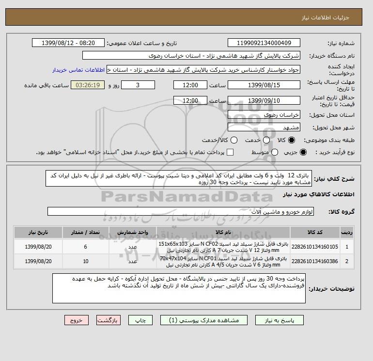 استعلام باتری 12 ولت و 6 ولت مطابق ایران کد اعلامی و دیتا شیت پیوست - ارائه باطری غیر از نیل به دلیل ایران کد مشابه مورد تایید نیست - پرداخت وجه 30 روزه, استعلام باتری 12 ولت و 6 ولت مطابق ایران کد اعلامی و دیتا شیت پیوست - ارائه باطری غیر از نیل به دلیل ایران کد مشابه مورد تایید نیست - پرداخت وجه 30 روزه