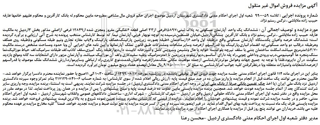 شماره پرونده اجرایی : کلاسه 9900059 شعبه اول اجرای احکام مدنی دادگستری شهرستان اردبیل موضوع اجرای حکم فروش مال مشاعی مطروحه مابین محکوم له بانک کارآفرین و محکوم علیهم خانمها عارفه حبیب زاده ملاباشی ، نرگس رستم نژاد.